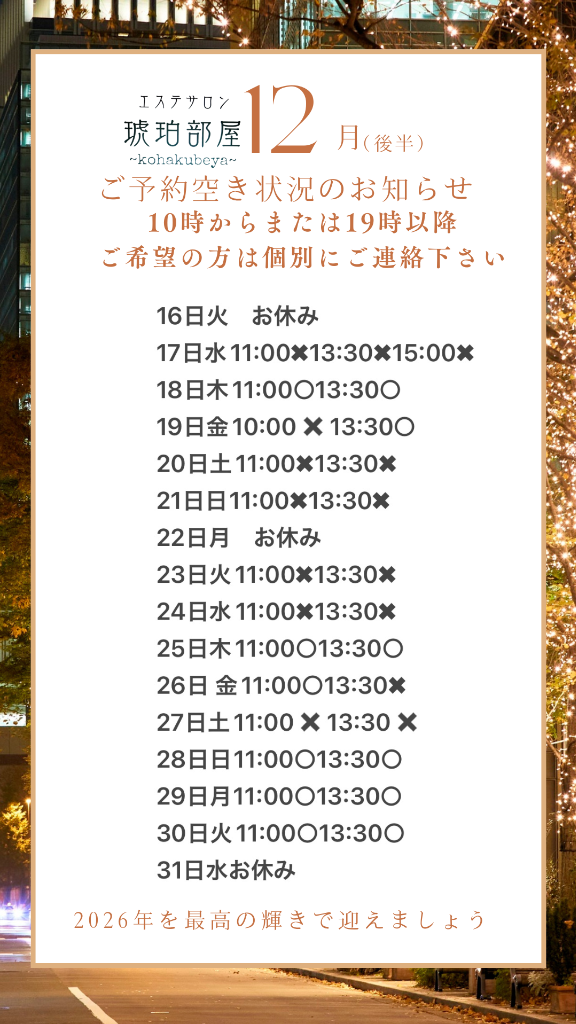 そんな時は自分で何とかしようとせず、人に委ねてみてください。自分の中で握りしめていた何かをスッと手放せ、心も体も軽くなります。その解放感を味わいに琥珀部屋にいらしてくださいね。